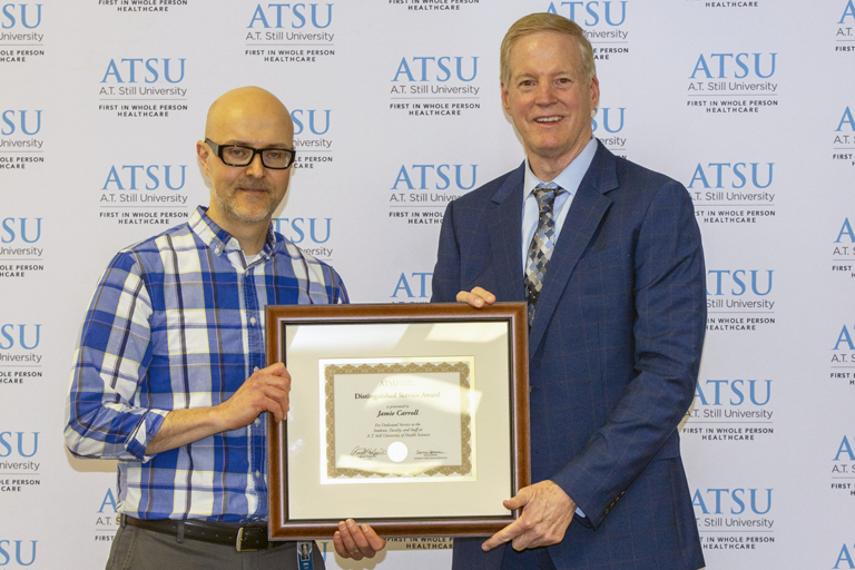 The 2024 Distinguished Service Award was presented to Jamie Carroll, BFA, senior graphic artist. The Annual Distinguished Service Award was created to recognize an employee who displays exceptional service to ATSU. Nominees must have a minimum of 10 years cumulative service to the University and display extraordinary dedication, service above self, a strong work ethic, and a positive outlook.