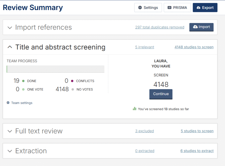 - Screen Titles & Abstracts: Breeze through screening with a quick interface that features keyword highlighting. It maintains full records of who voted and supports both single and dual screeners.