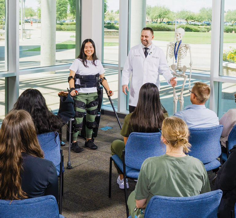 providers of the future. What started as a showcased robotic device at the University’s annual healthcare expo has become a catalyst for change across the University in classrooms, clinics, and communities. The device, a wearable exoskeleton, now plays a pivotal role in the lives of patients and the education of students. For patients, it provides renewed confidence and independence; for students, it provides a deeper understanding of their profession and the people they will serve.