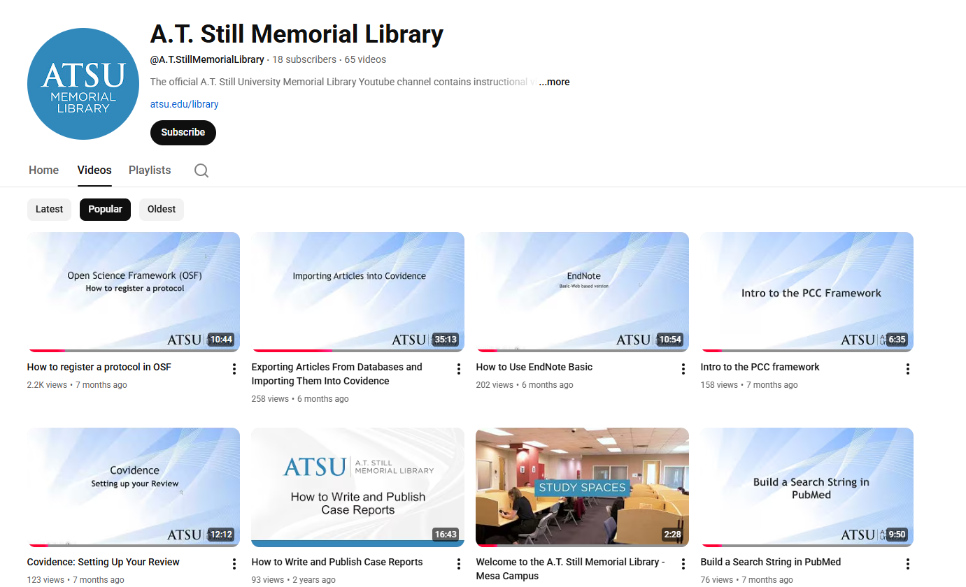 Did you know the library has a presence on YouTube? The official A.T. Still University Memorial Library Youtube channel is @A.T.StillMemorialLibrary. Check out our videos to learn more about research, literature searching, evidence-based practice, and scholarly publishing here: